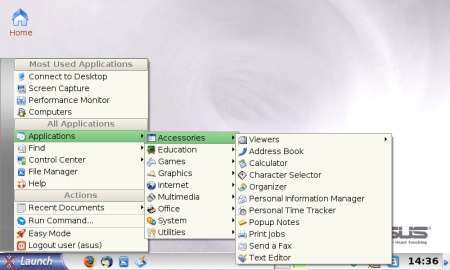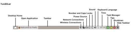 La taskbar , situata nell’estremità inferiore del desktop, può essere nascosta manualmente cliccando sulla piccola freccia che si trova sull’estrema destra della barra. Da qui, proseguendo verso sinistra, si trovano le seguenti icone: spegnimento del sistema; help in linea; task manager (curiosamente chiamato da Asus SOS ); orologio; menù per la modifica del layout/lingua della tastiera; volume; spie del blocco maiuscole; blocco numeri; indicatore di alimentazione e autonomia della batteria; connessione di rete; connessione wireless; e, sull’estrema sinistra, l’icona Home , che se cliccata minimizza tutte le applicazioni mostrando il desktop. Nella parte centrale, in standard Windows e KDE, vengono mostrate le icone delle applicazioni in esecuzione.