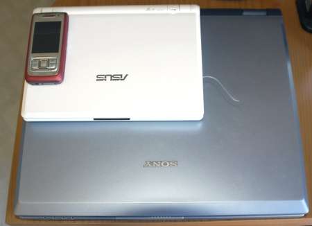 Le dimensioni dell’Eee PC a confronto con quelle di un notebook da 16 pollici (sì, avete letto bene, si tratta di un atipico modello da 16 pollici) e di uno smartphone. Purtroppo l’accostamento tra Eee PC e smartphone riesce bene solo in fotografia: il computer di Asus manca infatti del supporto a Bluetooth , e Linux non è certo il sistema operativo ideale per configurare un cavo dati, soprattutto se non si appartiene alla schiera degli smanettoni.