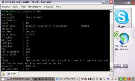 Il processore utilizzato dall’Eee PC è un Intel Celeron M Ultra Low Voltage 353 , un modello basato sull’architettura a 90 nanometri del Pentium M che è stato introdotto sul mercato nel luglio del 2004. Il chip ha una frequenza di clock nominale (ma non effettiva, come si vedrà) di 900 MHz, dispone di 512 KB di cache L2, ha un thermal design power di 5 watt e funziona con una tensione di 0,94 V. Nonostante il sistema operativo, come si può vedere nell’immagine, affermi che il processore sta girando a 900 MHz, in realtà questa frequenza è limitata a 630 MHz , valore correttamente rilevato sia da Windows XP che da eeeXubuntu. All’avvio, infatti, il BIOS riduce la velocità del front-side bus portandola da 100 a 70 MHz. Ci sono diversi modi per “sbloccare” la frequenza della CPU e riportarla a quella nominale, quali installare uno speciale modulo ACPI ( la cosa funziona anche con Ubuntu ), installare Windows XP e utilizzare il tool SetFSB , oppure aggiornare il BIOS con una versione non ufficiale, com la 8804 , che permette di regolare la frequenza dell’FSB. Con quest’ultimo metodo divesi utenti hanno però sperimentato instabilità, difetti nell’immaggine a schermo o problemi più gravi.