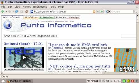 La versione di Firefox inclusa nel sistema operativo è quella standard, senza alcuna forma di personalizzazione e con Flash Player incluso. Come si può notare, l’area di navigazione è piuttosto ridotta, e l’atipica risoluzione di 800×480 punti adottata dall’Eee PC non è certo l’ideale per la navigazione su Web: questo costringe spesso ad una intensa attività di scorrimento delle pagine.