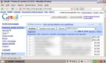 Questa schermata mostra come appare Gmail con la configurazione predefinita di Firefox: il layout del client web-based, come quello dell’intera suite di servizi offerti da Google (incluso Maps), è in grado di adattarsi alla risoluzione dell’Eee PC e riesce a mostrare una discreta porzione della mailbox.
