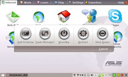 Questo è il menù che appare quando si preme il tasto di spegnimento oppure si clicca sul tasto Shutdown presente nella taskbar o nella sezione Settings. Da qui è possibile spegnere il sistema, riavviarlo, metterlo in stand-by, lanciare il task manager (gestore dei processi) o, se lo si è attivato, passare al Full Desktop (vedi sotto). Lo stand-by, attivabile anche chiudendo lo schermo, utilizza la cosiddetta modalità suspend to ram : in pratica, vengono spenti tutti i componenti hardware tranne la memoria RAM, dove viene conservato lo stato del sistema al momento della sospensione. Rispetto al suspend to disk , presente ad esempio in Windows, il suspend to ram ha come vantaggio una riaccensione del sistema quasi istantanea, ma come svantaggio il fatto di consumare la batteria, seppure in modo molto graduale. Attenzione, perché se la batteria si scarica mentre il sistema è in stand-by si perdono tutti i dati non salvati.