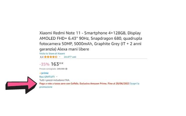 Il Redmi Note 11 by Xiaomi è lo smartphone giusto per chi cerca buone prestazioni e un prezzo conveniente. Oggi su Amazon lo acquisti a soli 163 euro, invece di 249,90 euro. Tra l’altro, se sei un cliente Prime, oltre alla consegna gratuita hai anche la possibilità di pagarlo in comode rate tasso zero selezionando Cofidis al momento del check out.