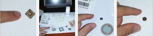 Gli RFID sono in sostanza dei dispositivi costituiti da un’antenna, in grado di operare ad una certa frequenza, e una memoria, in grado di contenere informazioni e in alcuni casi di essere riprogrammata. Opzionalmente, questo dispositivo può essere dotato di batteria di alimentazione, nel qual caso si parla di RFID attivi , se invece la corrente necessaria per funzionare viene direttamente prelevata (per motivi fisici che non è il caso di puntualizzare) dall’antenna, si parla di RFID passivi . Ecco alcune immagini di RFID passivi, ovvero senza batteria ausiliaria: