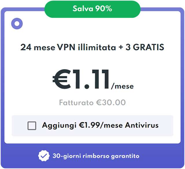 Per superare il blocco geografico, fortunatamente, esiste una soluzione tanto semplice quanto immediata: l’installazione di una VPN, con la connessione ad un server situato in Italia, in modo da simulare un collegamento a Internet dal proprio Paese e non più dall’estero. Tra i migliori servizi per rapporto qualità-prezzo segnaliamo PrivadoVPN, il cui piano di due anni è in offerta a 1,11 euro al mese, con in più tre mesi extra gratis e una garanzia di rimborso di 30 giorni.
