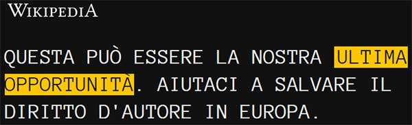 Chi oggi tenta di accedere a Wikipedia in italiano si trova di fronte a un muro invalicabile. Layout a sfondo nero e un messaggio che va subito al punto: “Questa può essere la nostra ultima opportunità, aiutaci a salvare il diritto d’autore in Europa”. Il riferimento è ovviamente al voto relativo alla Riforma Copyright sulla quale domani, martedì 26 marzo, si esprimerà il Parlamento Europeo.