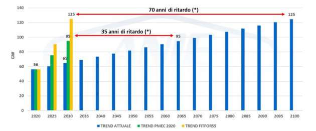Ad oggi è prevista una capacità di generazione annua stimata in 65GW, mentre gli obiettivi PNIEC indicano quota 95 GW e quelli FitFor55 indicano quota 125 GW. Ne consegue che, stimando un trend di produzione pari a 1GW/anno così come da attuale tasso di sviluppo delle rinnovabili nel nostro Paese, il ritardo accumulato è pari a 35 anni nel primo caso e 70 anni nel secondo.