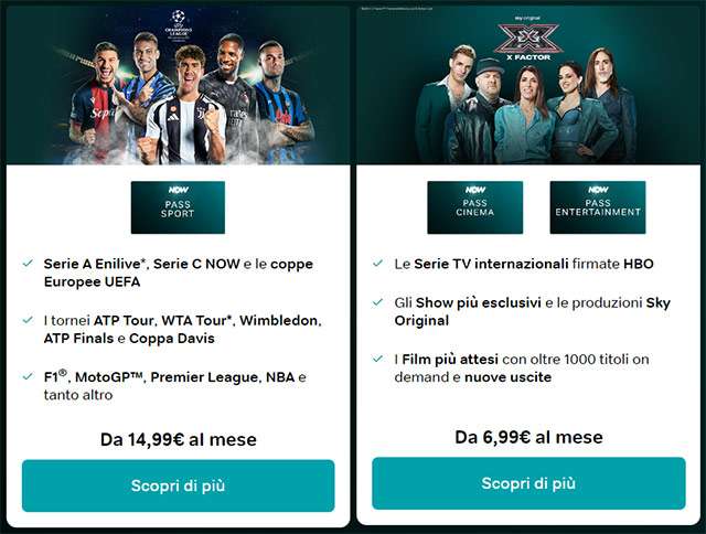 Non è tutto, perché il pass Sport a 14,99 euro al mese (invece di 24,99 euro al mese) assicura uno sconto mensile di 10 euro, che si traduce in un risparmio di 120 euro su base annuale. Sono include le partite del grande calcio di Champions League con cinque squadre italiane in gara, Europa League, Conference League, tre match per ogni turno del campionato di Serie A, le gare della Formula 1, quelle della MotoGP, i migliori tornei internazionale del tennis e tanto altro ancora.