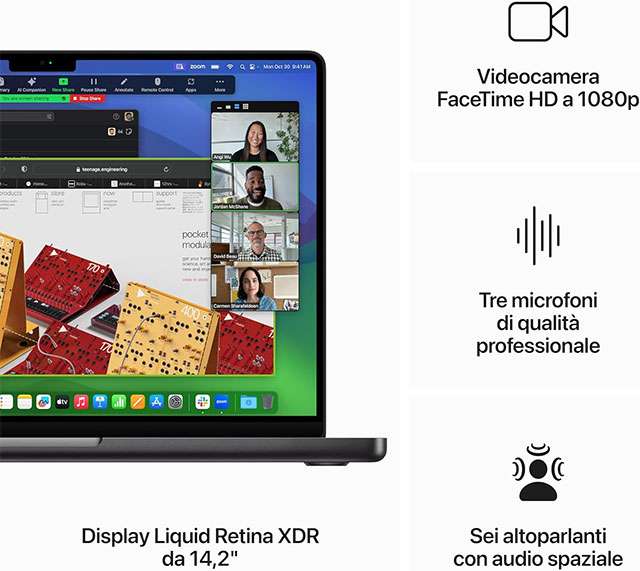 Pronto per l’intelligenza artificiale della suite Apple Intelligence (in arrivo a breve anche in Italia), integra la componente progettata dalla mela morsicata nella sua versione con CPU 12-core, GPU 18-core e Neural Engine 16-core. A questo si aggiungono ben 18 GB di memoria unificata e un’unità SSD da 1 TB per l’archiviazione dei dati. Per conoscere tutte le altre caratteristiche del comparto hardware, fai riferimento alla scheda completa delle specifiche tecniche. Il sistema operativo preinstallato è ovviamente macOS Sonoma con accesso garantito ai prossimi aggiornamenti.