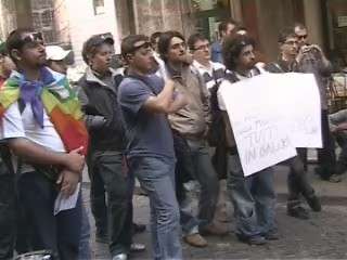 Di fronte al cordone delle forze dell’ordine, sotto lo sguardo attento di una telecamera di sicurezza, alcuni attivisti dei Verdi distribuiscono volantini e cartelli. Chi afferra i manifesti è giovane ed arrabbiato: forse ha lo sguardo di chi vede il proprio paese sprofondare verso una effettiva mercificazione totale della cultura, seguendo la tendenza internazionale. Gran parte dei presenti sono adolescenti . Un simpatico ragazzo, forse intorno ai 13 anni, esprime tutta la sua preoccupazione per il decreto: “Accidenti ma sai che cosa racconto a mia madre se mi arrestano? Io scarico solo due canzoni…”. Arrestano la madre?