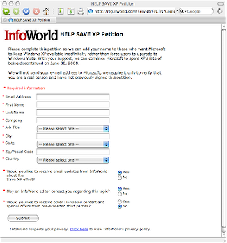 “Con il vostro supporto, possiamo convincere Microsoft a risparmiare a XP il destino di essere cancellato dal 30 giugno 2008”, si legge nel testo della petizione, che si riferisce alla data prevista di cessazione della vendita del sistema operativo. Secondo InfoWorld , milioni di persone si trovano più che bene con XP , e non vedono motivo per passare a Vista. “Non vale la pena cambiare tanto per farlo”, spiega Galen Gruman nell’ultimo degli articoli scritti sulla campagna, per controbattere le tesi di coloro che sostengono che il cambiamento sia necessario per garantire il progresso tecnologico.
