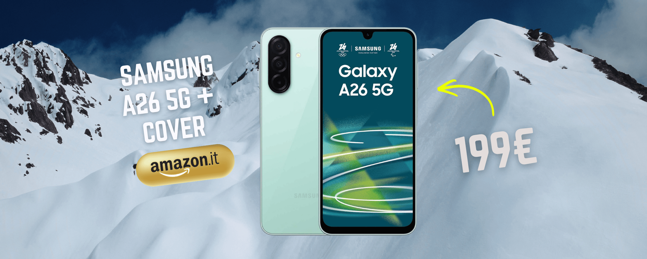 Samsung Galaxy A26 5G è lo smartphone ideale da acquistare: prezzo basso, ma prestazioni grandiose. Con cover in omaggio delle Olimpiadi di Milano Cortina, il telefono ti permette di avere tanta autonomia, scaricare qualunque applicazione e di scattare fotografie pazzesche. Insomma, se vuoi un prodotto pratico e di qualità, lui è da comprare subitosu Amazon a soli 199,99€ con lo sconto in corso.