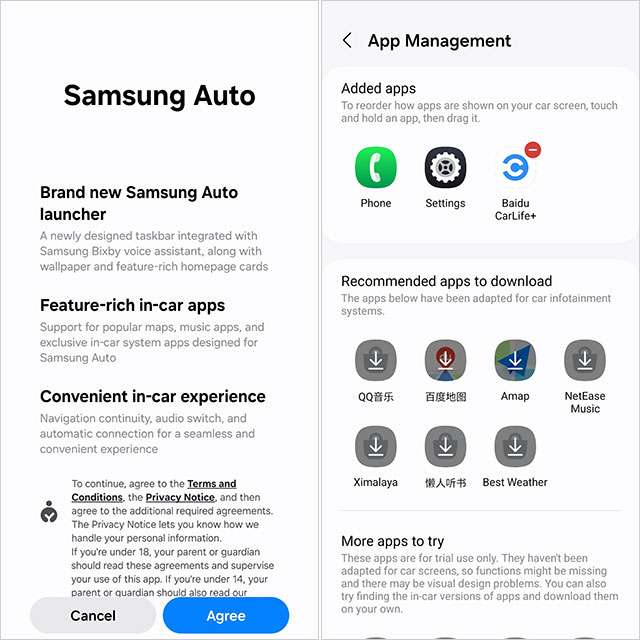 Si tratta di una funzionalità al momento riservata in esclusiva ai dispositivi Galaxy venduti in Cina. Richiede infatti una vettura con tecnologia Baidu CarLife+ oppure ICCOA CarLink, entrambi standard non presenti al di fuori del mercato locale.