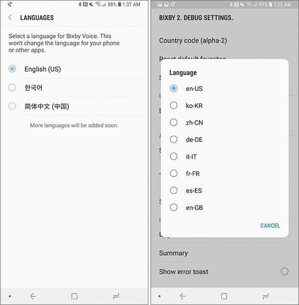 Il team di XDA-Developers è stato in grado di accedere al menu sia sul già citato Galaxy Note 9 sia effettuando una copia dell’applicazione e installandola sullo smartphone Galaxy S9+. Ad oggi Bixby offre il supporto completo per l’inglese, il cinese mandarino e il coreano.