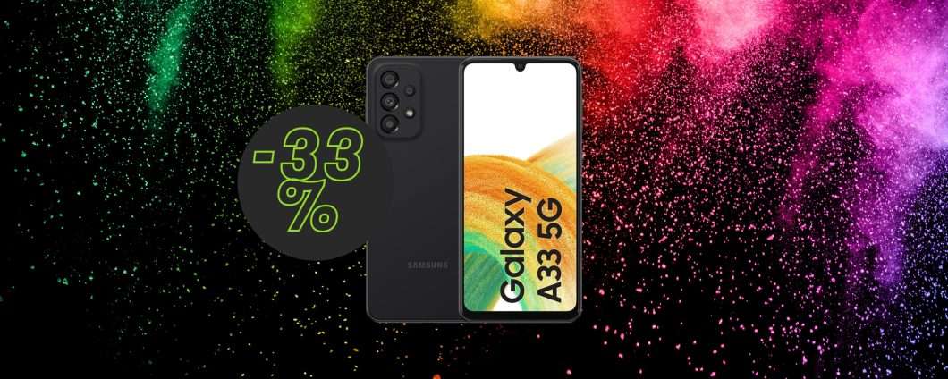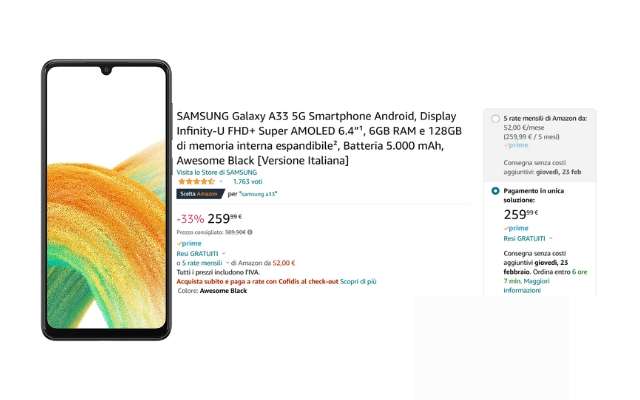 Il Samsung Galaxy A33 è uno smartphone furbo perché offre prestazioni decisamente premium a un sorprendentemente prezzo low cost. Oggi su Amazon lo acquisti al 33% di sconto. Ciò vuol dire che lo ricevi a casa a soli 259 euro con consegna gratuita e la possibilità di pagarlo in 5 rate a tasso zero da soli 52 euro al mese.