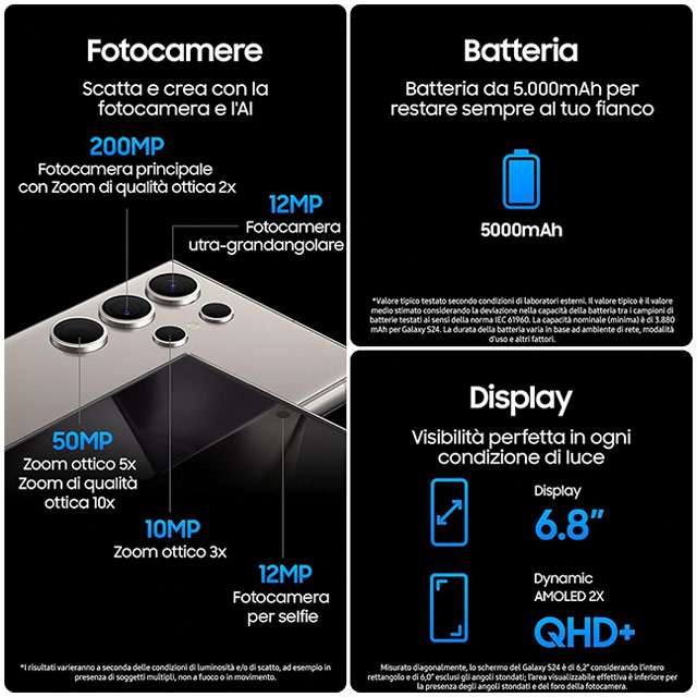 Tra le specifiche tecniche in dotazioni ci limitiamo a citare il display Dynamic AMOLED da 6,8 pollici (fino a 120 Hz) con risoluzione Quad HD+ con cui interagire anche tramite pennino, il processore Qualcomm Snapdragon 8 Gen 3, la tripla fotocamera posteriore con sensore principale da 200 megapixel, la connettività 5G, Wi-Fi 7 e Bluetooth 5.3 e la batteria da 5.000 mAh con autonomia elevata. Il sistema operativo è ovviamente Android con accesso a Google Play per il download delle applicazioni. Per conoscere altri dettagli rimandiamo alla scheda tecnica del top di gamma.