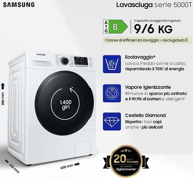 La capacità in fase di lavaggio è 9 Kg, quella di asciugatura 6 Kg, arriva a 1.400 giri al minuto. Fra i tanti punti di forza è da segnalare la presenza del cestello Diamond che protegge i capi più delicati, l’utilizzo del vapore igienizzante per rimuovere lo sporco più ostinato, i batteri e gli allergeni, la funzionalità Ecolavaggio per risparmiare fino al 70% di energia e la garanzia di 20 anni sul motore Digital Inverter. Le dimensioni sono 85 centimetri di altezza, 65 centimetri di profondità e 60 centimetri di larghezza. Tutti gli altri dettagli sono riportati nella scheda del prodotto.