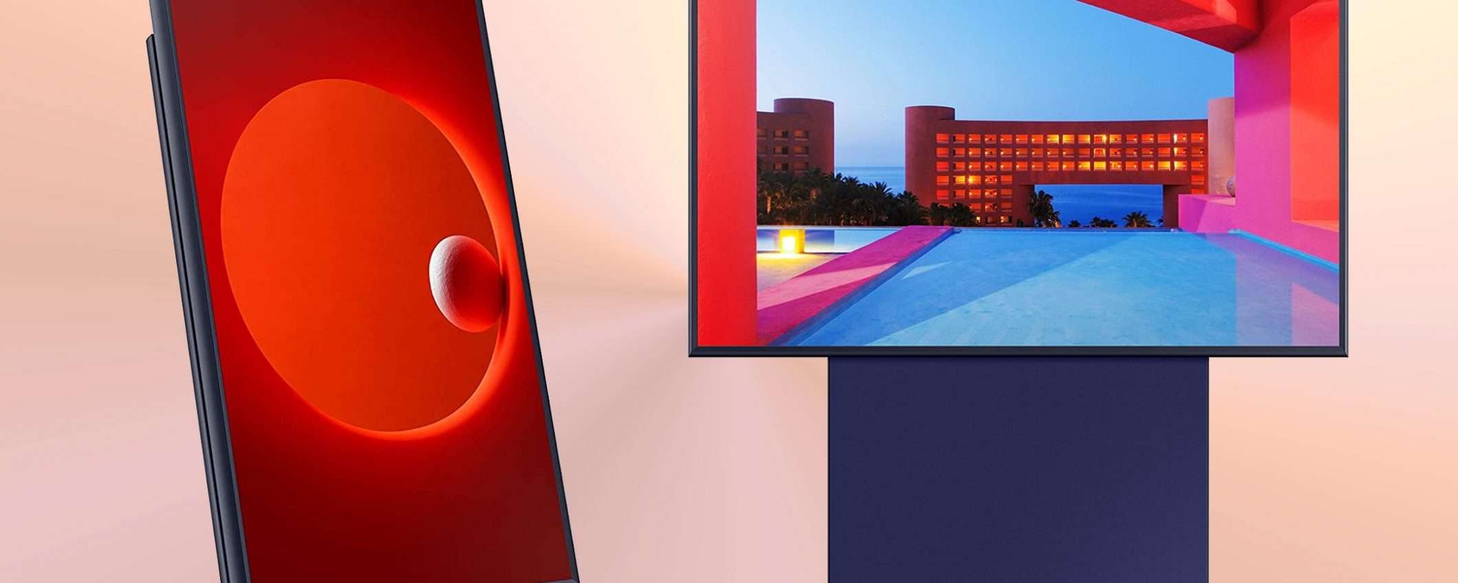 L’unicità di The Sero sta ne fatto che alloggia su un vero e proprio cavalletto verticale, con tanto di perno centrale che ne consente la rotazione e che permette alla tv di essere orientata in verticale in caso di necessità. In questa “modalità ritratto” la tv può ospitare app e fotografie, riducendo l’ingombro e diventando vero e proprio vezzo estetico per il design dell’ambiente domestico (o per esercizi commerciali che cercano un tocco in più da offrire ai propri clienti). “Non importa come lo usi“, recita Samsung: “The Sero ti permette di ottimizzare gli spazi e il concetto di display“.