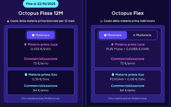 Stanco di bollette imprevedibili e offerte poco chiare? Octopus Energy propone un nuovo modo di gestire luce e gas: trasparente, sostenibile e senza vincoli. Con due tariffe semplici e competitive — Octopus Fissa 12M e Octopus Flex — puoi finalmente scegliere come pagare l’energia, in base alle tue abitudini e alla tua voglia di stabilità o flessibilità. Tutto con energia 100% rinnovabile e un servizio clienti premiato per efficienza e chiarezza.