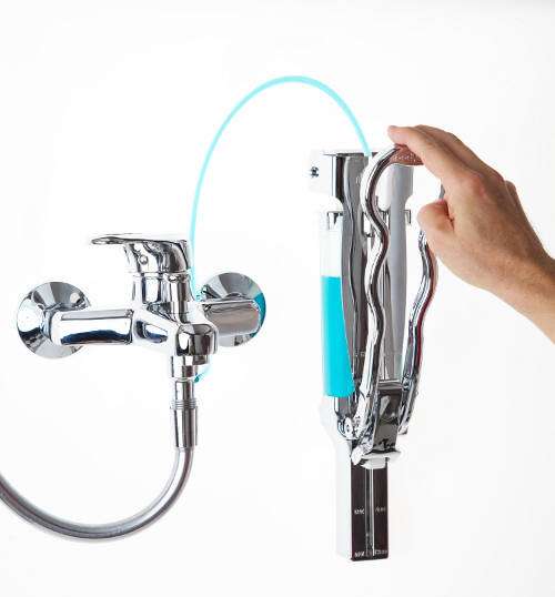 Mentre si lava il proprio corpo, è sufficiente abbassare la leva di BodySof, affinché il sapone venga forzato nella conduttura dell’acqua, per miscelarsi con essa e cascare poi a pioggia sulla pelle dalla cornetta della doccia.