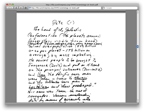 La Chiesa di Scientology è sul piede di guerra. Questa volta le sue attenzioni sono tutte per Wikileaks , la piattaforma per la pubblicazione di materiale in forma anonima, che dallo scorso marzo ospita due documenti fino ad oggi gelosamente custoditi dai fedeli del movimento fondato da L. Ron Hubbard. A far traboccare il vaso è la pubblicazione dell’intero manuale per la crescita spirituale dei fedeli redatto in massima parte da Hubbard stesso e contenente molte pagine manoscritte.