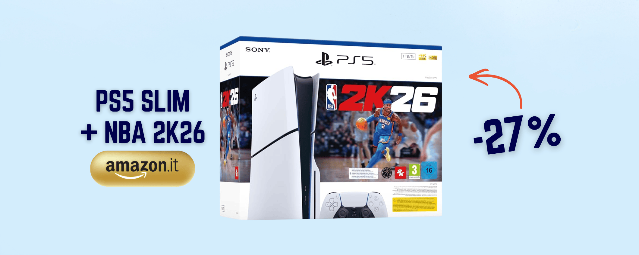 Hai atteso con trepidazione un periodo di sconti per acquistare la tua PlayStation 5? Finalmente è arrivato il momento per esaudire questo desiderio portando a casa console e la tua copia personale di NBA 2k26. La versione che ti sto suggerendo è quella in offerta alla festa delle offerte di Primavera su Amazon ed è la versione slim con lettore CD, scelta ottima se punti ad acquistare giochi in sconto (visto che le copie fisiche sono spesso in promo). Pronto all’acquisto? Mettila in carrello a soli 449,98€ con sconto del 18% subito.