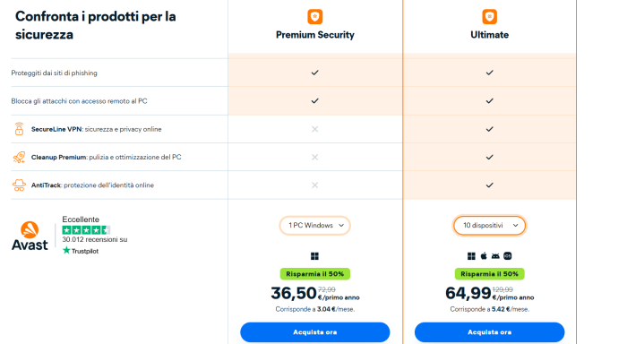 Se desideri una protezione digitale avanzata per tutti i tuoi dispositivi, la promozione di primavera di Avast è la tua occasione. Fino a un periodo limitato, Avast Ultimate è in offerta a 64,99€ per il primo anno, invece di 129,99€, con uno sconto del 50%.