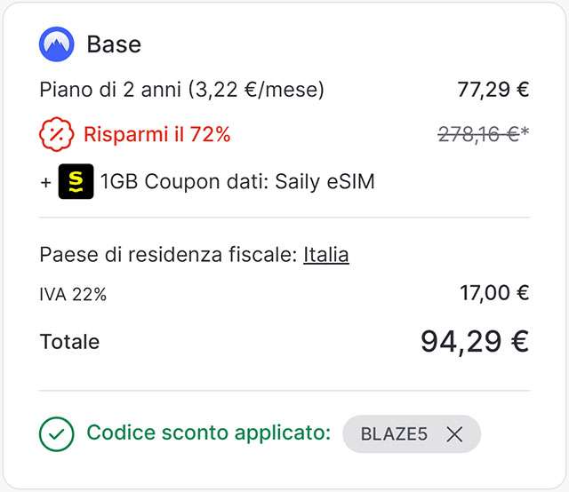 Oggi ti offriamo la possibilità di ottenere un risparmio extra sull’abbonamento a NordVPN, grazie al nostro coupon esclusivo BLAZE5: inseriscilo nell’apposito campo prima di effettuare l’ordine per attivare la promozione. Tutto ciò che devi fare è scegliere la formula più adatta a te tra Base, Plus e Ultimate, considerando le tue specifiche esigenze. Potrai così contare sulla soluzione definitiva per essere online ovunque, protetto e nascondendo il tuo indirizzo IP reale.