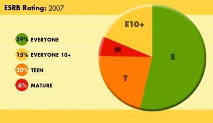 Nel 2007 ESRB ha assegnato il 59% di bollini E, il 15% di E10+, il 20% di T e il 6% di M (v. grafico sotto).