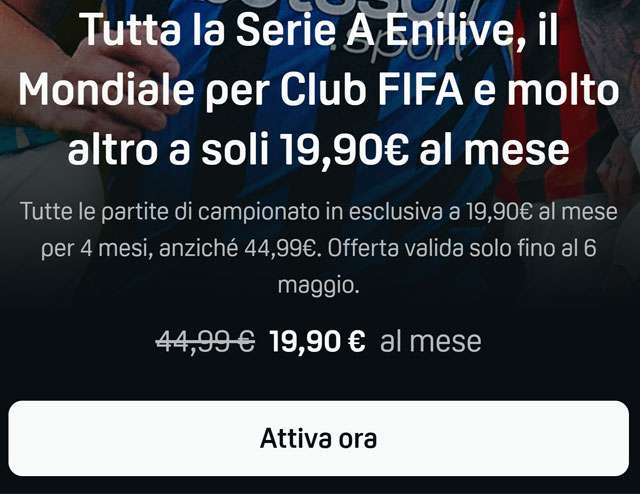 È in corso un’offerta speciale di DAZN che ti permette di attivare l’abbonamento Standard approfittando di un forte sconto. Invece di pagarlo 44,99 euro al mese come da listino, lo puoi sottoscrivere al prezzo mensile di soli 19,90 euro. Include tutta la Serie A e gli altri eventi in esclusiva come il Mondiale per Club che si disputerà da giugno.
