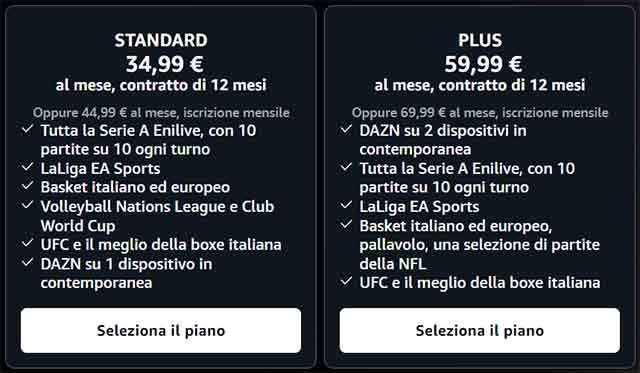 Le opzioni a disposizione sono due. La prima è quella rappresentata STANDARD, proposta a 34,99 euro al mese con sottoscrizione di 12 mesi e che include tutti i match del torneo oltre a un gran numero di altri eventi sportivi. La seconda, invece, è PLUS, a 59,99 euro al mese con la possibilità di vedere i contenuti su due dispositivi in contemporanea. Con entrambe c’è anche la Serie B.