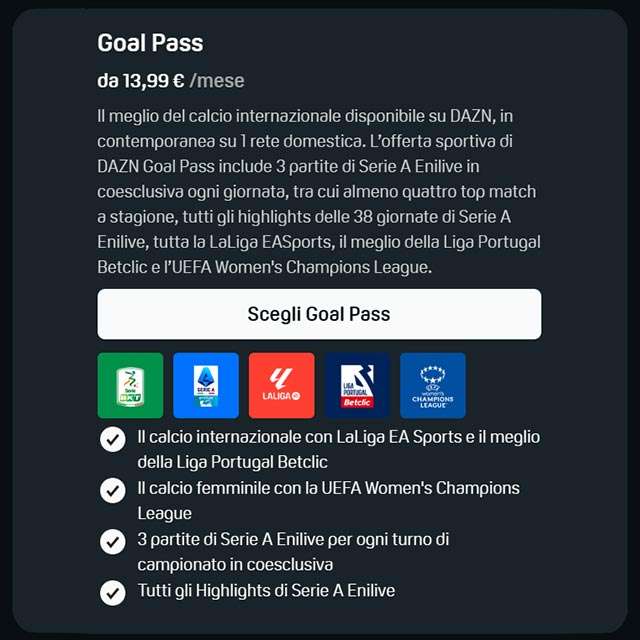Il Goal Pass di DAZN è proposto con un prezzo da 10,75 euro al mese se scegli l’abbonamento annuale con un un’unica soluzione di pagamento. Altrimenti, costa 13,99 euro al mese con formula annuale e pagamento dilazionato su base mensile oppure 19,99 euro nel caso di sottoscrizione per un solo mesi. Include anche il calcio internazionale con le partite de LaLiga e della Liga Portugal.