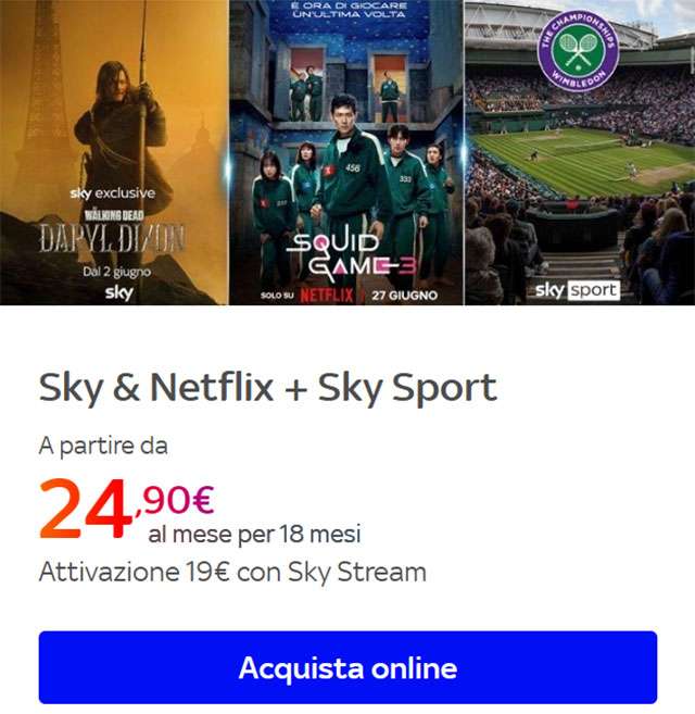 - Sky & Netflix + Sky Sport a 24,90 euro al mese (invece di 56,90 euro) per 18 mesi;