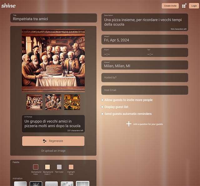 Non potevano certo mancare funzionalità basate sull’intelligenza artificiale. Tra queste, una si occupa di analizzare le immagini per suggerire quali è il caso di condividere e quali invece è meglio tenere private (o cestinare). Facendo leva sul modello DALL·E di OpenAI, inoltre, è in grado di generare temi da applicare a eventi specifici, ai quali saranno poi associati gli album fotografici. All’indirizzo shine.sunshine.com è possibile creare gli inviti. Questo il risultato di un breve test (come sempre l’IA regala soddisfazioni).