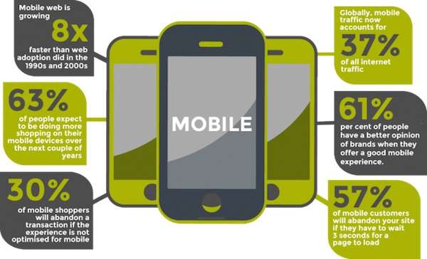 E ancora, secondo Mobify , l’adozione del mobile Web è cresciuta 8 volte più velocemente di quanto non sia avvenuto con il Web stesso fra il 1990 e il 2000, il traffico mobile occupa il 37 per cento dell’intero traffico Web, il 57 per cento dei clienti abbandona entro 3 secondi un sito privo di formato adatto alla navigazione mobile e il 61 per cento ha una migliore opinione di un brand che offra un’ottima esperienza mobile.