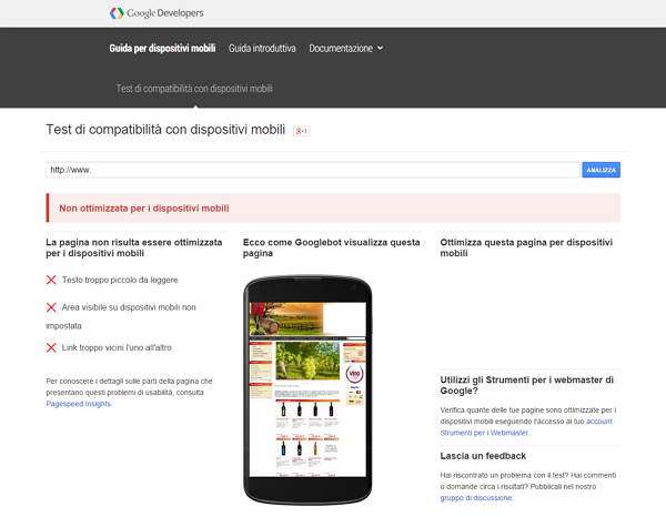 Lo strumento, accessibili da qui , offre un sistema automatizzato per verificare la qualità della navigazione mobile su qualsiasi URL digitato. Così, è sufficiente indicare l’indirizzo Web delle pagine da esaminare e in pochi minuti lo strumento sarà in grado di fornire un responso che non lascia dubbi all’interpretazione.