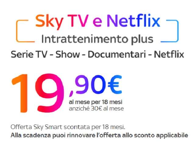 Avere Sky e Netflix insieme a meno di 20 euro al mese? Sì, è possibile. Tutto merito della promo Sky Intrattenimento Plus, che mette insieme in unico pacchetto Sky TV e Netflix a 19,90 euro al mese per i primi 18 mesi. Alla scadenza del periodo promozionale, potrai poi rinnovare l’offerta allo sconto applicabile.