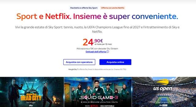 È uno dei prezzi più bassi mai raggiunti dal pacchetto in questione, dunque un’occasione per tutti coloro che vogliono guardare gli show originali di Sky, tutti i film e le serie tv di Netflix più gli eventi di Sky Sport a un prezzo scontato. Al termine dei 18 mesi verrà applicato il profilo Sky Open e il prezzo di listino alle condizioni vigenti a quella data. In alternativa si potrà rinnovare il profilo Sky Smart per ulteriori 18 mesi, dietro il pagamento una tantum di 9,90 euro, oppure disdire con un preavviso di 30 giorni.