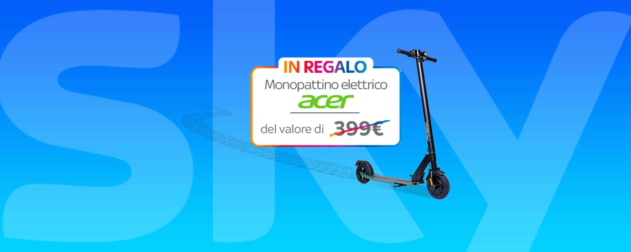 C’è una nuova offerta proposta da Sky, che vale la pena segnalare su queste pagine: è quella che regala un monopattino Acer eMobility dal valore di 399 euro: include il meglio dell’intrattenimento multimediale e un mezzo utile per muoversi in modo agile e sostenibile in città, tutto incluso al prezzo mensile scontato di 30,90 euro invece di 45,00 euro come da listino. Un’occasione da cogliere al volo.