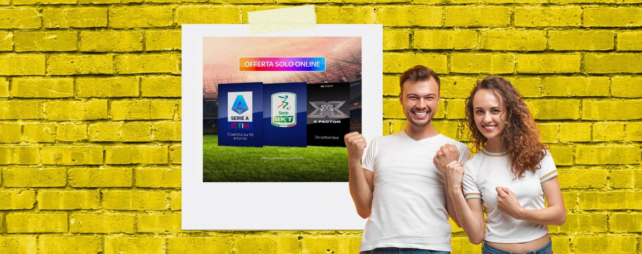 Attiva Sky TV + Calcio a soli 14,90 euro, invece di 30 euro al mese. Questo super prezzo è bloccato per 18 mesi. Approfittane subito, finché sei in tempo. Disponibile solo online, l’offerta in corso sembra avere validità fino al 3 settembre 2023. Attenzione però, perché se non ti abboni subito perderai la Serie A TIM, la Serie BTK e la nuova stagione di X Factor. Scendi in campo con i migliori!