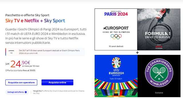 La promo in corso sul sito ufficiale di Sky rientra nell’ambito delle offerte lanciate in occasione degli Europei di calcio e delle Olimpiadi di Parigi, i due grandi appuntamenti sportivi che saranno trasmessi da Sky quest’estate.