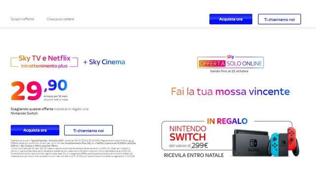 La nuova offerta Sky parla intrattenimento a 360 gradi. Da una parte hai i pacchetti Sky TV e Netflix insieme a Sky Cinema a soli 29,90 euro al mese per 18 mesi invece di 44 euro. Dall’altra, approfittando dell’offerta entro il 25 ottobre, riceverai gratis una Nintendo Switch entro Natale. Sì, è tutto vero.