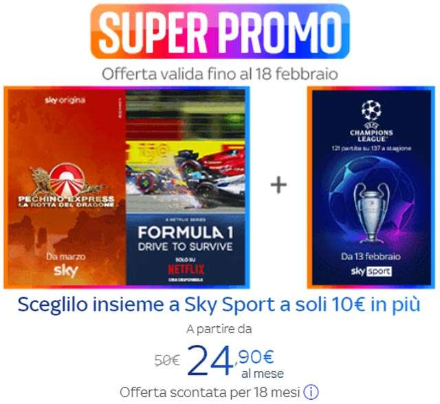 Non è tutto: con una piccola spesa extra c’è l’opportunità di includere nel pacchetto anche Sky Cinema (portando il costo a 19,90 euro al mese) oppure Sky Sport (a 24,90 euro al mese con le partite della Champions League, il tennis, la Formula 1 e tanto altro).