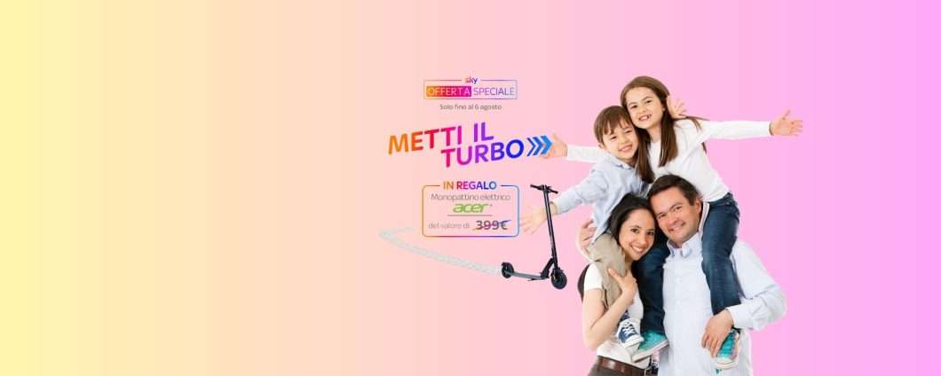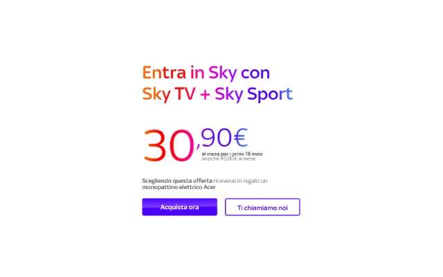 Oggi, domenica 6 agosto 2023, è l’ultimo giorno per attivare l’offerta speciale Sky TV + Sport e ricevere in regalo un Monopattino Elettrico Acer gratis. Del valore di 399 euro, questo omaggio ti permetterà di sfrecciare nel traffico cittadino senza attese e a zero emissioni. Diventa amico dell’ambiente e nel frattempo assicurati il miglior intrattenimento disponibile a un prezzo eccezionale. Abbonati a soli 30,90 euro, invece di 45 euro al mese.