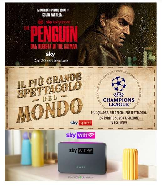- i pacchetti Sky TV, con tutto l’intrattenimento proposto da Sky e le serie TV in programmazione, e Sky Sport, con la Champions League, la Formula 1 e molto altro ancora; l’abbonamento è personalizzabile: è possibile, infatti, aggiungere altri pacchetti, come Sky Cinema e Sky Calcio, andando ad arricchire i contenuti dell’offerta proposta da Sky