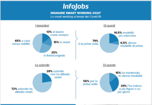 Un’altra accurata analisi è stata condotta da InfoJobs ad un mese dall’inizio del lockdown su un campione di 189 aziende e più di mille lavoratori, in cui sono stati evidenziati aspetti come la difficoltà riscontrate e cosa si augurano i lavoratori per il futuro, il tutto condensato in questa esaustiva infografica.