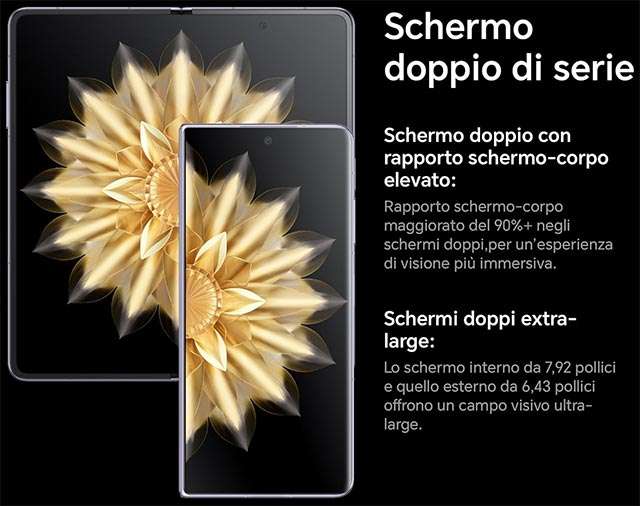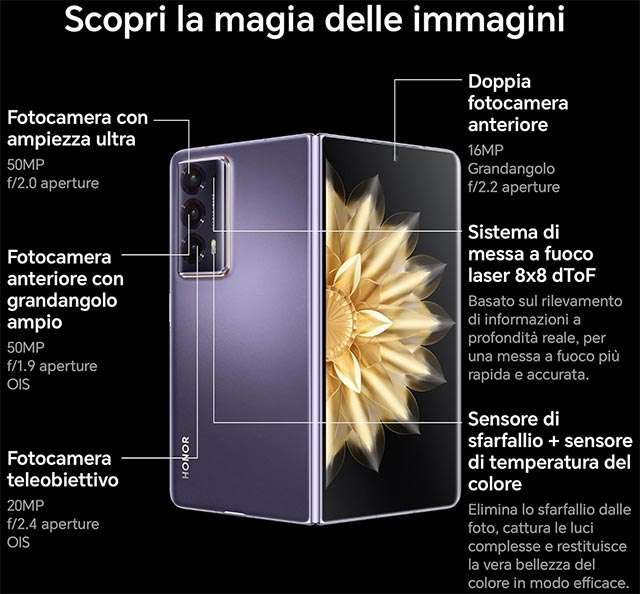 Progettato per ottenere un design dallo spessore ridotto a soli 9,9 millimetri quando chiuso e addirittura 4,7 millimetri da aperto, integra specifiche tecniche di fascia alta. Il processore Snapdragon 8 Gen 2 è affiancato da 16 GB di RAM e da 512 GB di memoria interna. Il comparto fotografico è davvero ricco con tre sensori posteriori (50+50+20 megapixel) e due anteriori. Ancora, c’è il supporto alla connettività 5G (anche Dual SIM), Wi-Fi 7, Bluetooth 5.3, senza dimenticare la batteria da 4.900 mAh con ricarica rapida SuperCharge da 66 W. Il sistema operativo preinstallato è MagicOS 8.0, basato su Android 14. Ci sono tanti altri punti di forza: per l’elenco completo fai un salto sulla pagina dedicata.