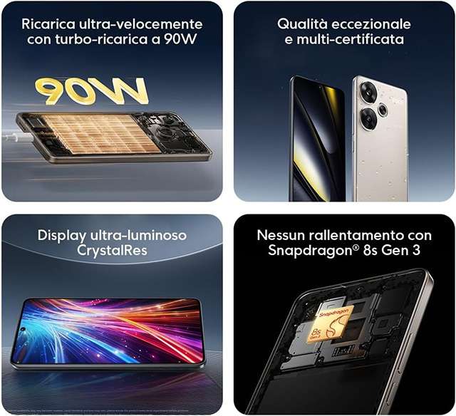 Ha in dotazione un display CrystalRes da 6,67 pollici con frequenza di aggiornamento fino a 120 Hz, il processore Snapdragon 8s Gen 3, una doppia fotocamera posteriore da 50+8 megapixel e il supporto alle reti 5G. Tra le altre specifiche tecniche troviamo poi connettività Wi-Fi 6 e Bluetooth 5.4, NFC, altoparlanti stereo e batteria da 5.000 mAh con supporto alla ricarica rapida da 90 W. Il sistema operativo è HyperOS, basato su Android, con accesso a Google Play per il download delle applicazioni. Trovi tutte le altre informazioni nella scheda del telefono.