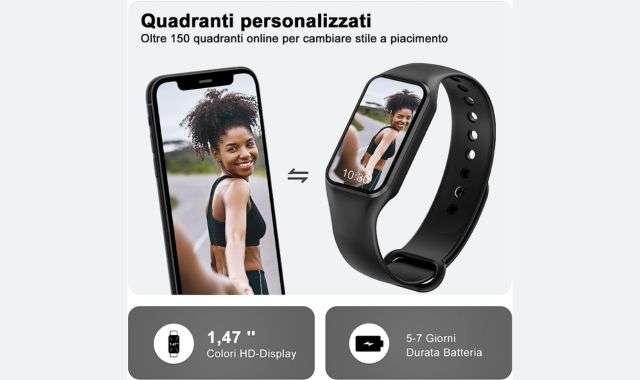Immagina di avere un display HD a colori da 1,47 pollici che cattura l’attenzione con la sua nitidezza e vivacità dei colori. Il cinturino in silicone fitness avvolge comodamente il tuo polso, mentre la lunetta ultrasottile delinea il display, mettendo in risalto le funzioni che ami di più. E la cosa migliore? Hai a disposizione oltre 150 quadranti online per personalizzare il look del tuo smartwatch in base al tuo stile unico.