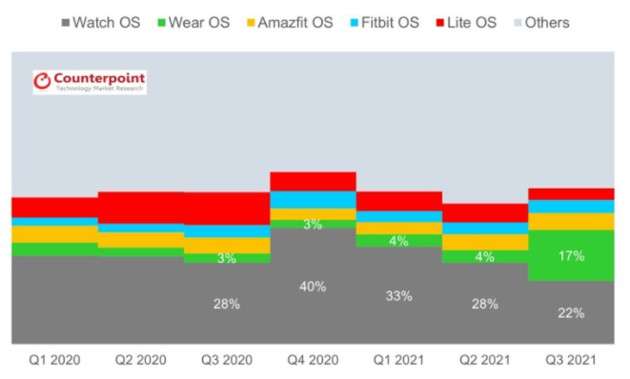 Una cosa è certa: il Samsung Galaxy Watch 4 è stato un successo. A indicarlo sono i dati Counterpoint che misurano la penetrazione dei vari brand sul mercato, con Samsung che ha vissuto una vera e propria esplosione rispetto ai dati del 2020. Questa crescita è avvenuta principalmente ai danni di Huawei (quota ormai quasi completamente fagocitata) e di Apple, la cui penetrazione scende dal 28% del Q3 2020 al 22% del Q3 2021.
